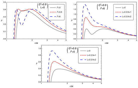 In Figure 3 we show the radial dependence of parameter for the different values of conformal factors L and N. The left panel corresponds to the Schwarzschild black hole () and plots are shown for the different values of angular momentum of magnetized particles for the fixed values of energy . In the central and right panels of Figure 3 the radial dependence of parameter is shown for the different values of conformal parameters L and N, for the fixed values of energy and angular momentum of particles. From the Figure 3 one can easily see that the value of the parameter has a minimum near the position for the value of l greater than . With the increase of both parameters of conformal gravity the minimum and maximum values of the parameter also increase. In case of the minimum of the graphs disappears at high values of parameter N due to the modification of the magnetic field structure near the horizon for the high values of the conformal parameter N (see Figure 2). From the results on radial dependence of magnetic coupling function for the different values of conformal parameters L and N presented in the Figure 3 one may conclude that the existence of the nonvanishing conformal parameters increases the gravitational potential around the central object. Consequently, the magnetic coupling parameter is responsible for the strength of the interaction between magnetized particles and external magnetic field which amplifies the gravitational field of compact object. This causes the stable circular orbits shift to the direction of observer at the infinity. In our previous works we have shown that the critical values of the parameters decreases with the increase of the values of tidal brane charges and negative deformation, while the increase the positive deformation causes the decrease of the parameter. Existing region of stable circular orbits shifts to the observer at the infinity with the increase negative deformation parameter and brane charges [44,46].