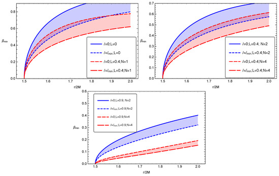The radial dependence of the minimum value of parameter for the different values of the conformal parameters L and N. The colored region represents the range for the values of in which stable circular orbits are allowed for magnetized particles for . The values of upper and lower limits of the parameter decrease with the increase of conformal parameters L and N. In top-left panel the blue and the light-red colored areas correspond to the case of Schwarzschild black hole and the values of the conformal parameters and , respectively. In top-right and bottom panels the blue and the light-red colored areas correspond to the values of the conformal parameter and for the fixed values of the parameter and , respectively.