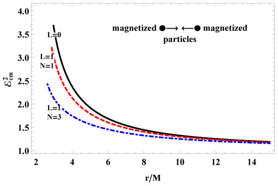 The expression for center-of-mass energy of the collision between two magnetized particles can be derived in the standard way substituting Equations (19)–(21) and (47)–(49) to Equation (38) as following