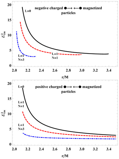 Figure 7 shows the radial dependence of center-of-mass energy of colliding (positive and negative) charged and magnetized particles with different values of the conformal parameters L and N. One can see from the Figure 7 in the case of collision of the negative charged and magnetized particles value of the center-of-mass energy decreases with increasing the values of the conformal parameters L and N. Moreover, increasing of the values the conformal parameters L and N the energy does not cause the high energy of colliding particles in the far region. The point where the center-of-mass energy is maximum comes closer to the central object in the case of the colliding magnetized and negatively charged particles; however, in the case of the collision of magnetized and positively charged particles the point is the same for all values of the conformal parameters.