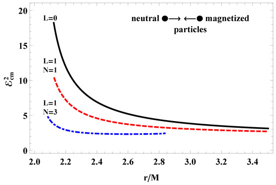 Radial dependence of center-of-mass energy of colliding neutral and magnetized particles for the different values of conformal parameters L and N. The plots are taken for the values of , and . The center-of-mass energy decreases with the increase of the conformal parameters.