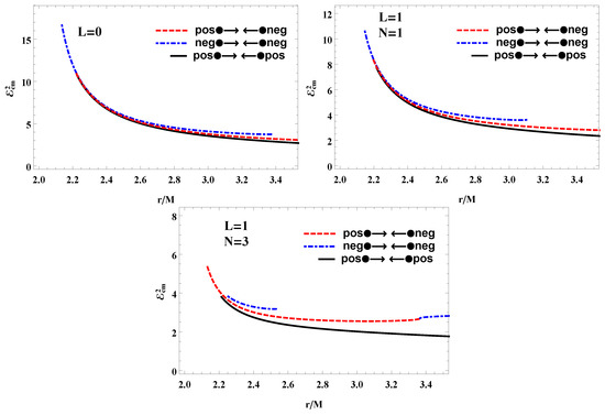 Figure 9 shows the radial dependence of the center-of-mass energy of colliding two charged (positive–positive, negative–negative and positive–negative) particles with different values of the conformal parameters L and N, considering the initial energy of both colliding charged particles, mass and the absolute value of electric charge of the particles are the same. One can also see that the energy decreases with increasing the value of both L and N. On the other hand, the dependence of the energy on radial coordinate looks slightly different for collisions of positive–positive, negative–negative and positive–negative charged particles. The analysis of the particles acceleration near the black hole in conformal gravity shows that the increase of the gravitational potential energy of the central object results in the change of the center-of-mass energy of the colliding particles. However, the innermost collision position does not depend on the parameters of the conformal gravity. This is related to the fact that innermost collision point coincides with the photon sphere and conformal parameters do not affect the photon sphere [12,13]. Consequently, the inner position of the collisions point remains unchanged in the conformal gravity.