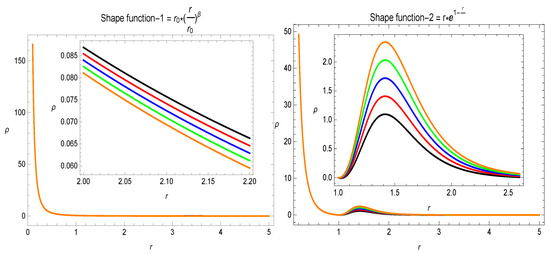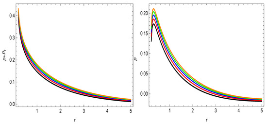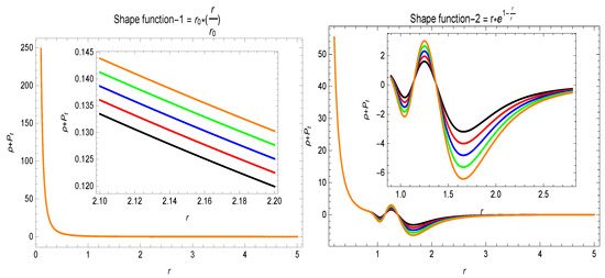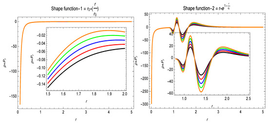 - In the Figure 5, Figure 6 and Figure 7, the behavior for the two specific shape-functions given in Section 5 is given. is violated and the energy density is positive for different values of the parameter . This violation of indicates the presence of some exotic matter, which is a requirement for a traversable wormhole solution.