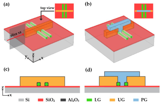 All simulated results are extracted 1 nm below the Si–SiO2 interface, close to the expected peak of the quantum dot wavefunction [23]. Firstly, Figure 1a model with Al gates are simulated at 10 nm SiO2 thickness where the positive and negative strains results for all x, y, and z components are shown in Figure 2c. Note that the actual gate-defined quantum dot is formed in the Si–SiO2 interface in between . Based on Figure 2c, large negative strains are observed between x = −40 and +40 especially regions with stacked materials Si/SiO2/Al/Al2O3. Similarly, when the Al gates are replaced by Pd gates, the trend is the same, however, with reduced negative strain, as shown in Figure 2d. This also means Pd can reduce compressive stress of Al2O3 due to lesser CTE mismatch.