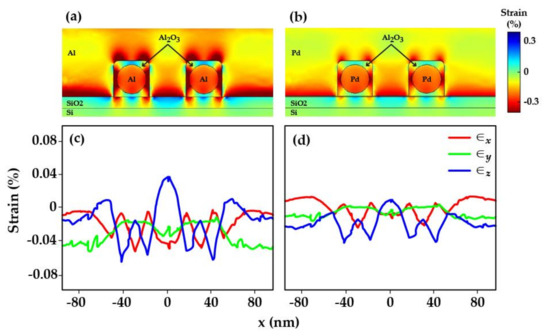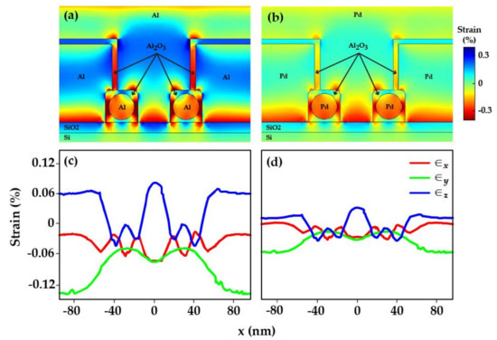 Simulated strain for Al and Pd gates on Si-bulk based on Figure 1b model at the SiO2 thickness of 10 nm. (a,b) are the cross-section strain cut at xz axis plane, while (c,d) are the strain components , and at 1 nm below the Si–SiO2 interface for Al gates and Pd gates, showing the effect of strains from CTE mismatch of Al–Al2O3 and Pd–Al2O3, respectively.