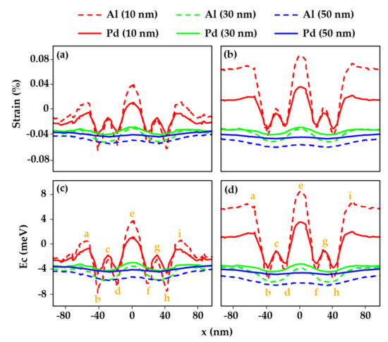 At this stage, unintentional dots are apparent as the average strain magnitude is still much larger than 0.02%. Based on previous studies, the strain effects can be manipulated by varying the SiO2 thickness [8]. Figure 4a,c show the strain and conduction band respectively for both Al and Pd, at the SiO2 thickness of 10 nm, 30 nm, and 50 nm. As the SiO2 thickness increases, the overall strain reduces significantly shifting the unintentional dots from x = −40 and +40 to x = −30 and +30. However, it is important to note that thicker SiO2 may require larger voltages across all the metallic gates and may eventually cause leakage currents between the gate to gate layer [26].