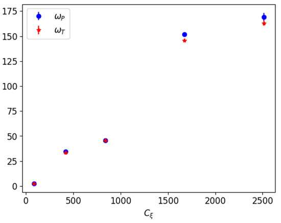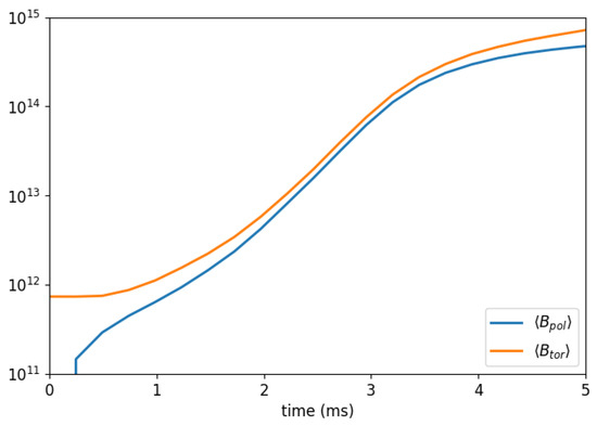 where —with the polar radius of the star—and , where sets the strength of the field overall, is continuous at . Our definition of d is due to the fact that in our case the star is not completely spherical, but is slightly oblate, as can be seen in Figure 2, and we decided to study the evolution of the system exclusively within the star, where the quantities of interest are significantly appreciable. We choose (in geometrized units), corresponding to a maximum value of the magnetic field of the order of G. Figure 4 shows the time evolution of the average poloidal and toroidal components of the magnetic field. We see that the exponential growth phase begins and ends with a small delay compared to the previous case. Furthermore, just like in the previous case, in the post-exponential growth phase the toroial field has a higher intensity than the poloidal one.