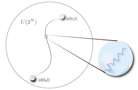 where is the density matrix corresponding to the time-evolving state and j denotes the number of time steps each of interval . Essentially, (30) provides a microscopic step-by-step (i.e., from j to ) description of a time-evolving quantum state (23), Figure 2. While geometrically, considering the intrinsic penalty factors of the unitary manifold (22), it corresponds to the “weighted choices” the geodesic makes each time step. That is, at each time step the geodesic evolution, dictated by the instantaneous Hamiltonian (27)–(29), and bounded by the penalty factors chooses a computationally economical (i.e., mildly penalized) direction. Moreover, assuming the initial state factorizes as