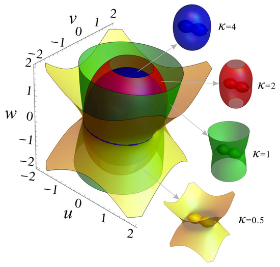 The zero-velocity surface (or curve) with perturbations helps us to analyze the third body’s dynamic behavior under the influence of a specific perturbation factor, which is different from that of classical R3BP. For example, when , and , the zero-velocity surface is different from the classic R3BP due to the presence of . For the parameter values presented in Table 1, Figure 1 shows the four zero-velocity surfaces when takes 0.5, 1, 2 and 4, respectively. It is easy to find that the structure of the zero-velocity surface of Equation (9) is more open as the value of becomes smaller and smaller. Because the geometry of the zero-velocity surface (or curve) will vary with the value of the Jacobi constant C and , we can numerically analyze the zero-velocity surface (or curve) and then find the libration points of Equation (7). Without loss of generality, now we only study the surfaces and curves for the case .