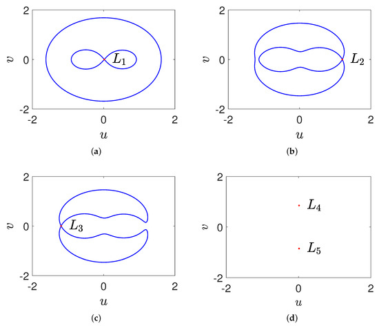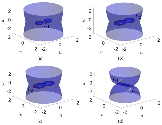 For , the forbidden region of the third body changes with the Jacobi constant C as shown in Figure 2 and Figure 3. With the decrease of C, five regular libration points , are discovered gradually and the forbidden region of motion of the third body is shrinking. More precisely, the third body can only fly in the two ellipsoidal areas around the two primaries when , and the two ellipsoidal motion areas are connected together through the “tangent point” (marked as librarian point ), and the third body can pass from one primary to the other through when , but it cannot fly out of these two ellipsoidal areas. When , the peanut-shaped flight area is connected to the outer space through a new “tangent point” , and when the value of C continues to decrease, the third body can only enter the outer space in this direction. When C drops to 3.57940, we will discover another new “tangent point” in the opposite direction, which is the libration point . At this time the third body can also fly from this direction to outer space when the value of C continues to decrease. For the Jacobi constant , the symmetrical libration points and appear at the same time. Now the third object can escape into outer space in any direction around the two primaries. Therefore, as a summary of Figure 2 and Figure 3, the corresponding five planar librations points can be identified as follows , , , , . Besides, there are several methods for determining the libration points. For example, the total number of collinear libration points for this problem can also be determined based on the theory of topological degree [58].