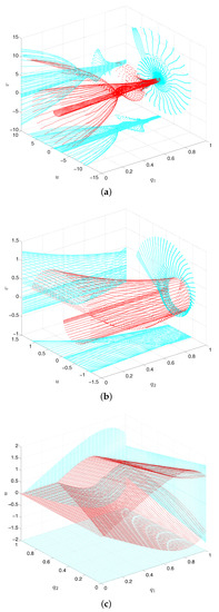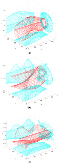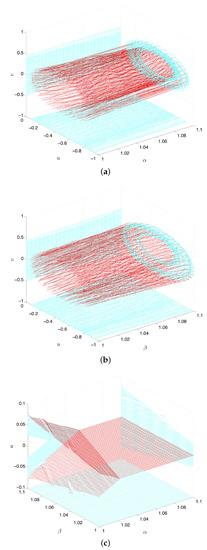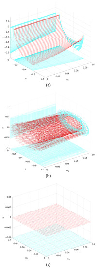We note that the three-body problem has a high degree of complexity due to its dynamic equations’ extremely strong nonlinearity. Any subtle changes in different parameters may substantially change the third body’s dynamic behavior. Thus, we will analyze the effect of different perturbation parameters on the third body’s dynamic behavior through the bifurcation diagram. After a large number of numerical simulations, we select as the initial value of the iteration. Combining the conditions in Section 2, we restrict the Coriolis force and centrifugal force to [1, 1.1] in the --u frame, Figure 4a,b show the influence of the perturbation of and on the variables u-v, respectively, and reflect the corresponding chaotic characteristics. However, the joint perturbation of and shows that the amplitude of the third body in u direction no longer changes when (see Figure 4c).