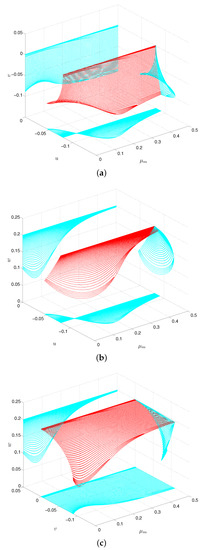 (a–c) Bifurcation diagrams of the mass parameter in the frames , and , respectively, when , .