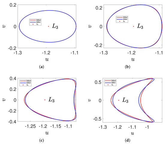 Note that different values of not only determine the positions of the libration points, but also affect the shape of the second- and third-order periodic solutions through Equation (22). This is because the coefficients of Equation (22) are related to (see Appendix A for details). In order to better illustrate the approximate periodic solution obtained above, we show the phase portraits of the above approximate analytical periodic solutions near the libration point under the four cases of , 1, 2, and 4 respectively (see Figure 9a,d). When the value of is small, it is easy to find that the difference between the second- and the third-order approximate periodic solution is insignificant (see Figure 9a,b). Especially for the periodic solutions in Figure 9a, the second- and third-order approximate analytical periodic solutions on the two-dimensional plane around agree very well, and they are almost indistinguishable visually. In this state, the second-order approximate periodic solution can be regarded as the alternative to the third-order case. If the values of other parameters remain unchanged, we can easily find from Figure 9c,d that the difference between the second- and third-order approximate periodic solutions become more and more significant as increases. Therefore, we can conclude according to Figure 9 that the smaller the value of , the better the degree of agreement between the second- and third-order approximate periodic solutions, and vice versa.