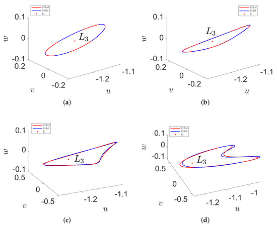 Based on the results of the above analysis, we show the three-dimensional periodic solution near the collinear libration point for four different values of 0.5, 1, 2, and 4 in Figure 10. When and , the second- and third-order three-dimensional periodic solutions agree very well, as shown in Figure 10a,b. When = 2, although Figure 10c shows that the second- and third-order periodic solutions are somewhat different, the degree of agreement is also good. However, Figure 10d (corresponding to = 4) indicates that the second- and third-order periodic solutions differ significantly. Therefore, it is easy to find that the smaller the value of , the better the approximation effect.