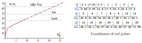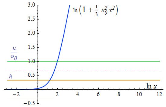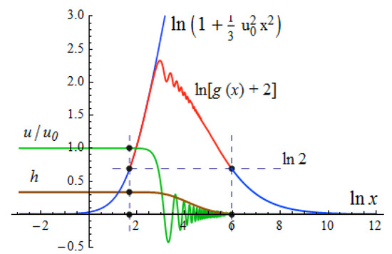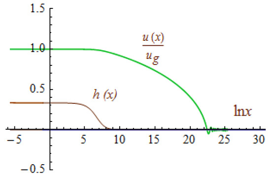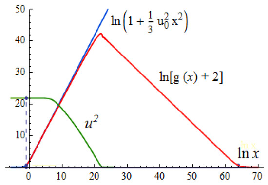 is the dimensionless elasticity of the condensate. The red line is raised two steps up. On the double logarithmic scale, both the growing part and the decreasing part are straight lines. The growing blue line is (41) of the analytical solution at the upper boundary (43). The green line presents the dimensionless density of the condensate Small details (damped oscillations of oscillations of at the transition from growth to decrease; and two points on the level at and where ) are not visible in the huge range from cm to cm in Figure 5. This is why I presented Figure 2 for clarity. The topology of a regular static solution to Equations (21)–(24) is the same in both limiting cases: with a huge mass and with an extremely small mass .
