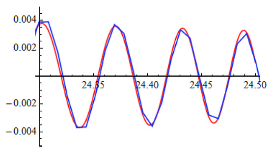 Fragment of oscillating in the interval derived analytically (54) (red line) and found numerically (blue line). The angularity of the blue line is due to the fact that the condensing oscillations in the huge interval () are obtained at the limit of computer accuracy.