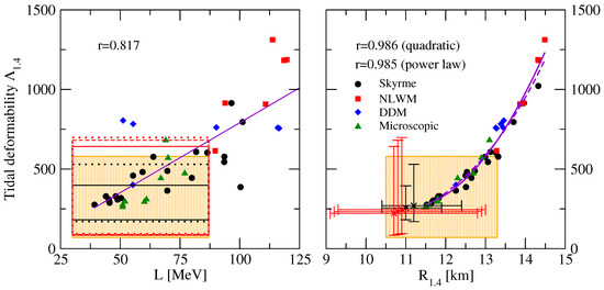 One of the main theoretical issues, following the detection of gravitational waves from NS mergers, regards the possibility of finding correlations between properties of nuclear matter and NS observables [126]. Along this same line, we further explore this issue, and using the set of microscopic EoS and the several Skyrme forces and relativistic models listed in Table 1, in the left panel of Figure 4 we show the tidal deformability of a 1.4 solar mass NS as a function the symmetry energy parameter L at saturation density. The orange box shows the constraint on inferred from the observational data of the GW170817 event [14] together with the experimental limits of L reported in Table 1. We observe some degree of correlation between the tidal deformability and L, for which we can estimate the so-called correlation factor r, defined as