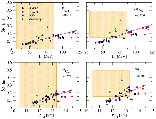 The neutron-skin thickness is displayed as a function of the symmetry energy derivative at saturation density L (upper panels) and of the radius of a NS (lower panels) for the different EoS displayed in Table 1. In the left (right) panel calculations are shown for (). The band on the left panel shows the experimental constraint on L, whereas the box on the right one shows in addition the constraint from the PREX experiment [136]. The violet line indicates a linear fit of the EoS data, Equation (25). The values of the corresponding correlation factors are also given.