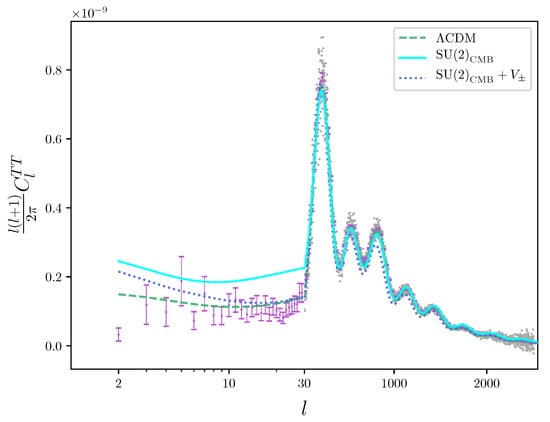 In [34] a simulation of the new cosmological model subject to SU(2) and the Dark Sector of Equation (9) was performed using a modified version of the Cosmic Linear Anisotropy Solving System (CLASS) Boltzmann code [53]. Best fits to the 2015 Planck data [8] on the angular power spectra of the two-point correlation functions temperature–temperature (TT), electric-mode polarisation–electric-mode polarisation (EE), and temperature–electric-mode polarisation (TE), subject to typical likelihood functions used by the Planck collaboration, were performed. Because temperature perturbations can only be coherently propagated by (low-frequency) massless modes in SU(2) [40] the propagation of the (massive) vector modes was excluded in one version of the code (physically favoured). Furthermore, entropy conservation in ee annihilation invokes a slightly different counting of relativistic degrees of freedom in SU(2) for this epoch [54]. As a consequence, we have a z-dependent density parameter for (massless) neutrinos given as [34]