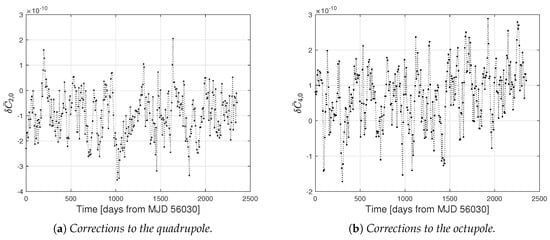 Corrections to the quadrupole () and octupole () coefficients estimated, arc by arc, on the time span of our analysis. The GGM05S model was considered for the background gravitational field of the Earth.