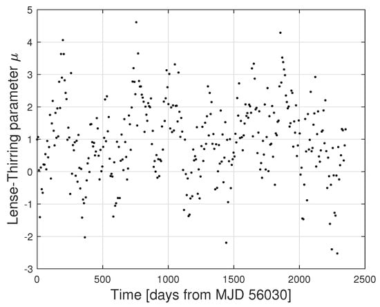 The Lense-Thirring parameter estimated, arc by arc, in the time span of our analysis. For the mean value we obtained (at a 95% confidence level). The standard deviation of these residuals is about 1.20; this large value is due to the unmodeled periodic effects. The GGM05S model was considered for the background gravitational field of the Earth.
