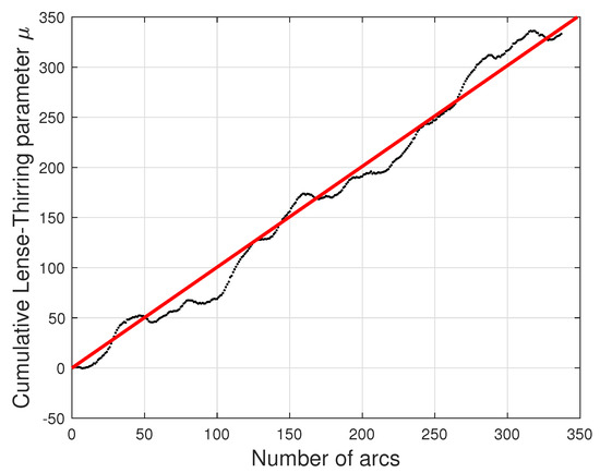The Lense-Thirring parameter (black dots) obtained as the slope of the cumulative sum of the values shown in Figure 3. The horizontal axis shows the number of arcs of the satellites POD. The slope of the linear fit (red line) provides a value of (at a 95% confidence level), see Table 4. The impact of the unmodeled periodic effects is reduced in the case of the cumulative residuals. The GGM05S model was considered for the background gravitational field of the Earth.