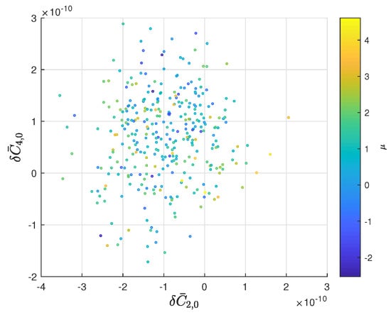 The correlation is particularly small between and the correction , as well as between the two corrections, and . Conversely, the correlation is moderately larger between the Lense-Thirring parameter and the correction . The relative low degree of correlation among the relativistic parameter with the corrections to the first two even zonal harmonics can be represented in the colorbar plot that is shown in Figure 5, where the values for are distributed in relation to those assumed by and .