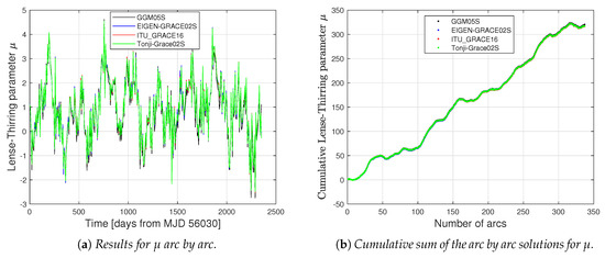 Comparison of the results obtained for the Lense-Thirring parameter from the solution of the system of Equation (7) for the four gravitational fields models considered in the present analyses. (a) The results for the mean value of is the same (after rounding) for the three models we considered in addition to GGM05S: (at a 95% confidence level), again with a standard deviation of about 1.20. (b) The results for the slope obtained for the three additional models (EIGEN-GRACE02S, ITU_GRACE16 and Tonji-Grace02s) are shown in Table 4.