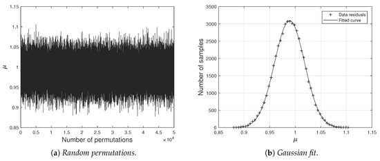 (a) Realizations for after 50,000 random permutations of the 337 residuals of Figure 3. (b) Distribution of the results for the Lense-Thirring parameter after the 50,000 permutations. For each realization, is obtained by means of the slope of the best linear fit like in Figure 4. The GGM05S model was considered as the background gravitational field of the Earth.