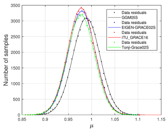 where represents the mean of the Gaussian and the error represents the standard deviation of the Gaussian with a 95% confidence level. This result has a discrepancy of about 1% with respect to the result that was obtained in previous Section 6; consequently, this value confirms a 1% contribution of the unmodeled periodic terms in the overall error budget of the measurement25.