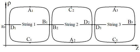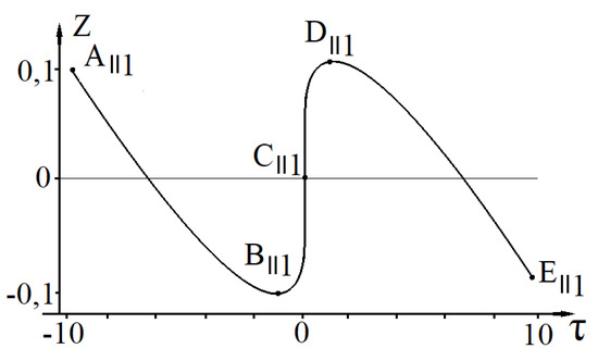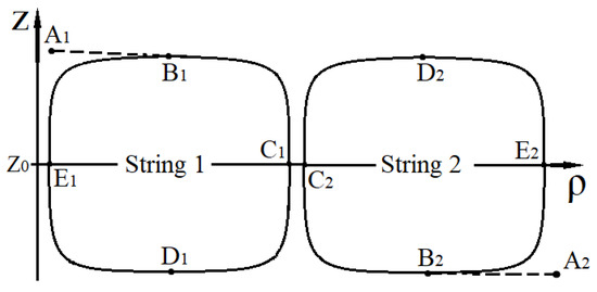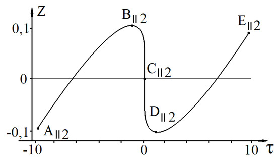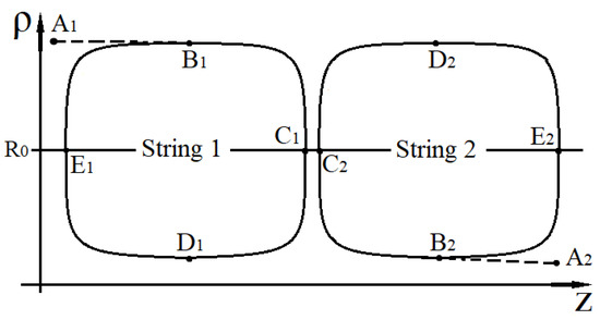 On the segment –, the test null string moves towards the source null string, i.e., in the positive direction of the z axis. At the point , the test null string and the source null string are on the same surface (). On the segment –, the test null string again moves in the negative direction of the z axis. However, the distance in the variable z between the test null string and the source null string in this segment is already increasing (we can say that the test null string is attracted by the decreasing gravitational field of the source null string). At the point , the test null string leaves the zone of interaction of the source null string.