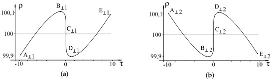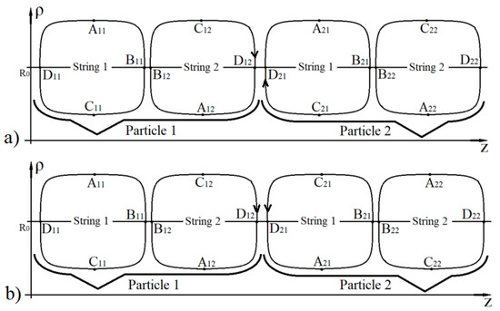 Thus, Figure 9 shows two cases of the location of two pairs of interacting null strings (“particle 1” and “particle 2”). The direction of motion for each null string is specified by a sequence of points: , , , , , …, where the first index corresponds to the number of the particle and the second index corresponds to the number of the null string. Points on the trajectories of motion of null strings, which are denoted by the same letter (regardless of indices), determine the position in space of each null string for the same time value.