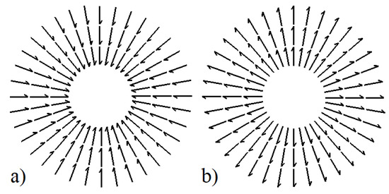 Formed “threads” can be part of more complex spatial structures. The most interesting is the possibility of combining the “threads” into spherically symmetric formations (domains). With such a union, null strings belonging to neighboring “threads” are located on spherical surfaces (form layers of the domain), and the “threads” themselves are located orthogonal to the layers, i.e., are located at the radii of a spherically symmetric domain. Figure 11 schematically shows two possibilities of such a combination. Each vector in Figure 11 corresponds to a null string (the vector characterizes the direction of motion of a gravitationally interacting null string that forms a “thread”). The plane of location of null strings forming the domain is orthogonal to the direction of the corresponding vector.