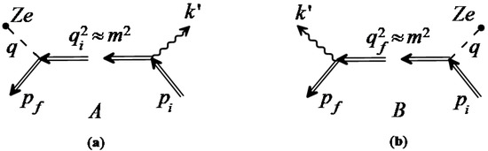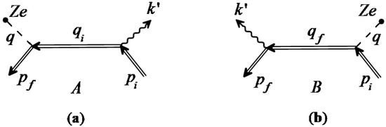 Resonant bremsstrahlung of ultrarelativistic electrons in the fields of a nucleus and X-ray pulsar. (a) Diagram A corresponds to the channel A. (b) Diagram B corresponds to the channel B.