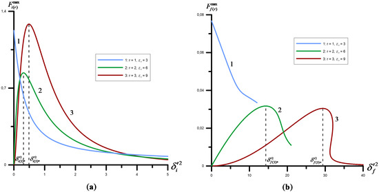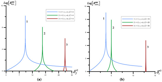 (a) Dependency of function on parameter for the fixed value of the hard gamma-quantum frequency. (b) Dependency of function on parameter for the fixed value of the hard gamma-quantum frequency. The figure consists of 1, 2, and 3 resonances from expression (91). The magnitude of the characteristic parameter—, the characteristic energy— MeV, the energy of the initial electron— MeV.