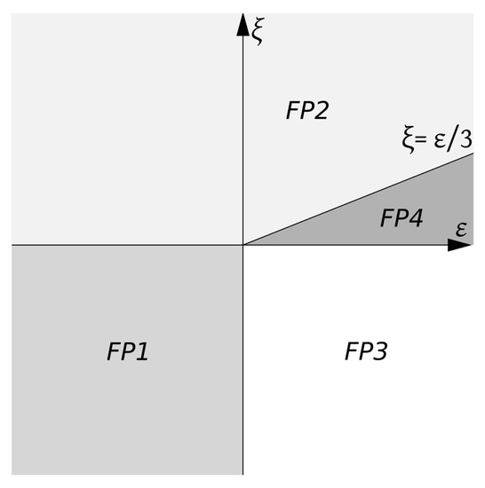 The general stability pattern of the fixed points in the plane is shown in Figure 1. The straight line denotes the border between the stability regions (areas where the points are IR attractive) of the points FP2 and FP4. The stability regions of all points have neither gaps between them nor overlaps. The Kolmogorov values and (i.e., ) lie in the stability region of the point FP2.