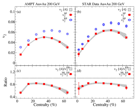 The charged particles centrality dependence of and are compared to the four-particles elliptic flow (hashed band) for Au+Au collisions at = 200 GeV from the A Multi-Phase Transport (AMPT) model panel (a). The charged particles centrality dependence of and are compared to for Au+Au collisions at = 200 GeV from the STAR experiment [18,72] panel (b). The elliptic flow fluctuations represented by the ratios and are presented in panels (c,d).