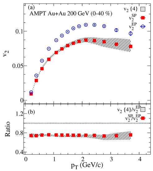 In this work, the centrality intervals are defined by selecting the impact parameter distribution, then the AMPT events are analyzed using (i) the event plane method and (ii) the multi-particle cumulant technique [66,67,68,69]. Using both methods, particle of interest (POI) comes from pseudorapidities , which matches the STAR experiment pseudorapidity acceptance, and with transverse momentum .