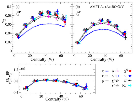 The centrality dependence of the identified particles panel (a), panel (b) and panel (c) are shown in Figure 3 for Au+Au collisions at = 200 GeV from the AMPT model. The results of and show the mass ordering effect on the observed magnitude. This mass ordering effect, which cancels out for the ratio , presented in panel (c) indicates the domination of the initial-state eccentricity fluctuations in the AMPT model.