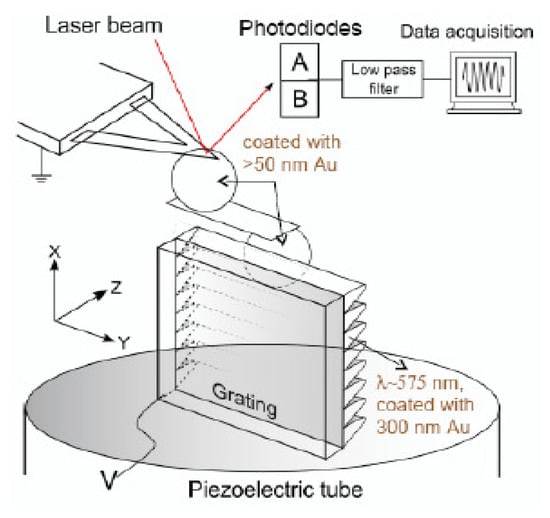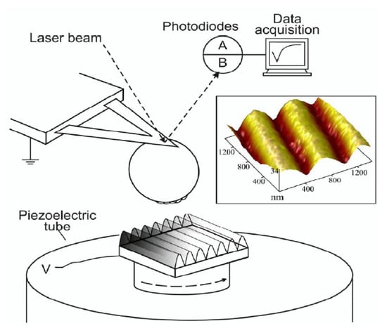 The schematic of the experimental setup is shown in Figure 2 []. A sinusoidally corrugated grating was vertically mounted on the piezoelectric tube. A smooth sphere was placed at the end of the cantilever of an atomic force microscope. A mica sheet was attached to the bottom of this sphere. The second sphere was attached to the bottom free end of the mica sheet. Then, the sinusoidal corrugations were imprinted on the second sphere from the grating as a template using a special procedure []. This ensures a parallelism of the corrugation axes on both test bodies. The interacting surfaces were covered with an Au layer.