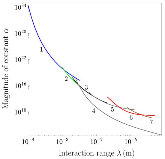 Both these Yukawa forces were calculated and used for constraining of and in []. The constraints following from (10) are shown by line 5 in Figure 3 (line 4 is discussed at the end of this section). They were the best ones within the range of from 89 to 465 nm.