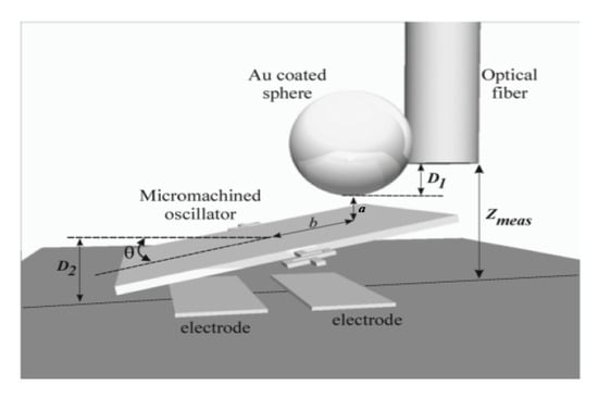 At nm the stronger constraints have been obtained from measuring the effective Casimir pressure between two parallel plates by means of a micromechanical torsional oscillator [,]. The schematic diagram of this measurement is shown in Figure 5 []. The oscillator consisted of an Au-coated plate suspended at two opposite points on the midplane. Under the plate there were two electrically contacted electrodes used to measure the capacitance and to induce oscillation in the plate at the resonant frequency of the oscillator. Above the plate there was an Au-coated sphere of radius R attached to the side of an Au-coated optical fiber. The separation between the plate and the sphere was determined as