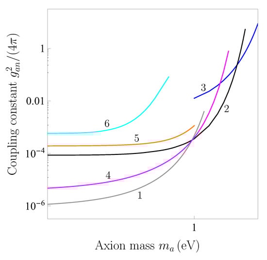 The constraints on an axion-to-nucleon interaction are usually displayed graphically as depending on the axion mass . Similar to the Yukawa-type interaction, the region of the plane above the line is excluded by the results of the respective experiment and below the line is allowed. By line 1 in Figure 6 we show the constraints on the axion mass and interaction constant following from the Casimir-less experiment. Below they are compared with similar constraints following from several other experiments.