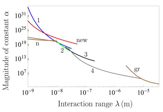 According to [], the weakly bound molecules can be used as sensitive sensors for the non-Newtonian gravity. Calculations show that the precision spectroscopy of these systems will allow to strengthen constraints on the interaction of the Yukawa type obtained from the experiments on neutron scattering (lines labeled “n” in Figure 7) at least by the two orders of magnitude. Note that a few constraints obtained from atomic spectroscopy in the range of extremely small are discussed in [].