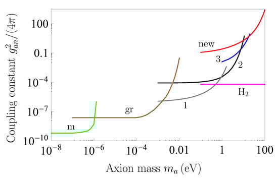 In the case of axions, this experiment leads to competitive constraints up to eV. For eV the constraints following from the Casimir physics (lines 1–3 and “new” in Figure 8) become much weaker than the constraints obtained from experiments on measuring the forces between protons in the beam of molecular hydrogen [,]. These constraints are shown by a line labeled “H” in Figure 8. For axions with eV the constraints of line “H” were further strengthened by comparing with theory the experimental results on the nuclear magnetic resonance for nucleons in deuterated molecular hydrogen [].