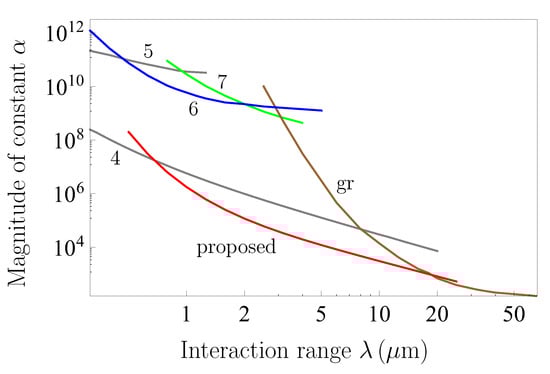 In Figure 9, the constraints on the Yukawa interaction constant , which could be obtained from the CANNEX test, are shown by the line labeled “proposed”. For comparison purposes, lines 4–7 and “gr” following from experiments discussed in Section 2 and Section 4 are reproduced from Figure 7. As is seen in Figure 9, the proposed line provides an order of magnitude stronger constraints on than those given by line 4 following from the Casimir-less experiment. It is seen also that the proposed constraints encroach on the province where the Cavendish-type experiments presently lead to the strongest constraints shown by the line labeled “gr”.