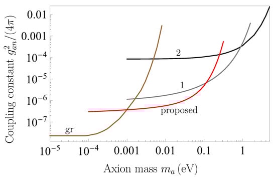 Within the wide range of from eV to 1.7 meV the strongest constraints on the axion-to-nucleon coupling constant valid for the GUT axions follow from the gravitational experiments of Cavendish type []. These constraints derived in [] are shown by the line labeled “gr” in Figure 8. For meV the strongest constraints on are given by line 1 reproduced from Figure 6 which was obtained from the Casimir-less experiment.