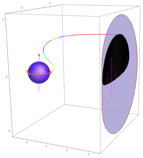 A space orientation of the supermassive black hole M87* and its equatorial accretion disk relative to a distant observer at the Earth (or at the near-Earth space orbit) is shown in Figure 9. The dashed magenta circle in this Figure and in all other similar Figures corresponds to the black hole event horizon image in the imaginary Euclidean space. Two 3D photon trajectories are also shown, starting from the different points of the circle with a radius at the thin accretion disk (light green oval) in the equatorial plane of rotating black hole with the spin and reaching a distant observer near the outer contour of the event horizon silhouette (dark gray region). Parameters of these two photon trajectories are and and, respectively, and .