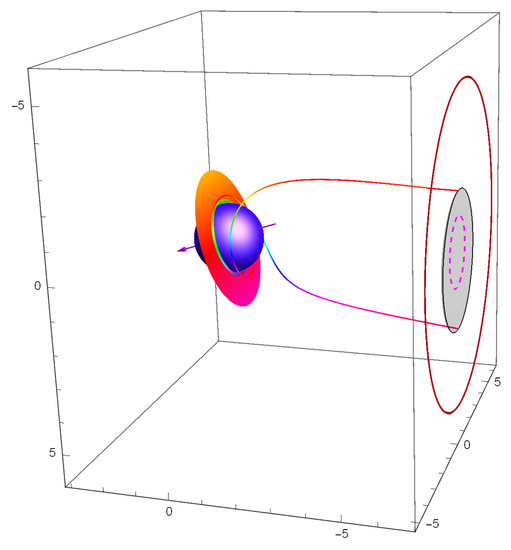See in Figure 2 the corresponding 3D illustration of the classical black hole shadow formation in the extreme Kerr black hole case (). As in Figure 1, the luminous background is placed behind the black hole at the distance, exceeding the size of all photon spheres. A closed purple region is an envelope of all photon spheres for photons with and, respectively, a closed green region is an envelope of all photon spheres for photons with ). Multicolored curves in this figure are the examples of photon trajectories, producing an outline (boundary) of the classical black hole shadow, with orbital parameters, respectively, —corotating skimming photon in the equatorial plane, —counter-rotating photon in the equatorial plane and —fully spherical photon orbit. A blue disk with a radius inside the black hole shadow is the observed position of the black hole event horizon in the imaginary Euclidean space (in the absence of gravity). The magenta arrow is the black hole rotation axes.