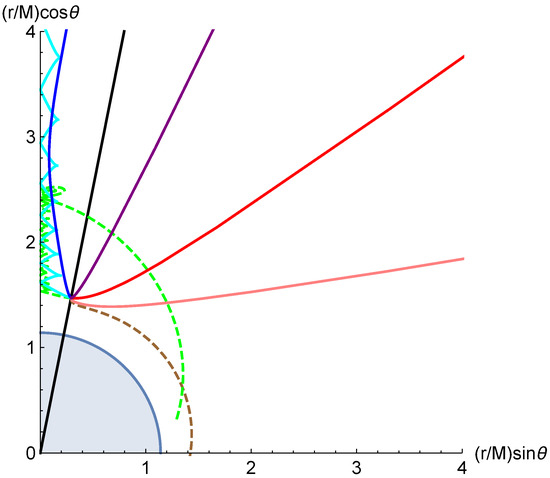 Examples of trajectories in plane near the Kerr black hole with M. All trajectories start from the initial position M, ; however, they depend on . The black straight line represents , and the blue quarter circle represents the horizon.